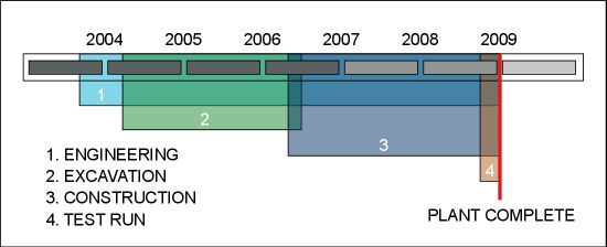 Excavation work was completed in the summer of 2006. Construction work is currently underway and will be followed by machinery and equipment installation, EIA (electrical, instrumentation and automation) work and HVAC and plumbing work.